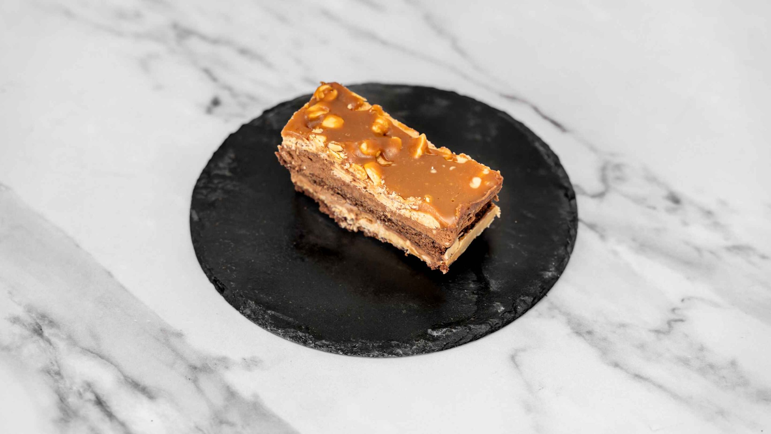 A rich peanut butter and caramel stack layered on soft brownie cake, topped with crunchy peanuts and a drizzle of melted milk chocolate sauce