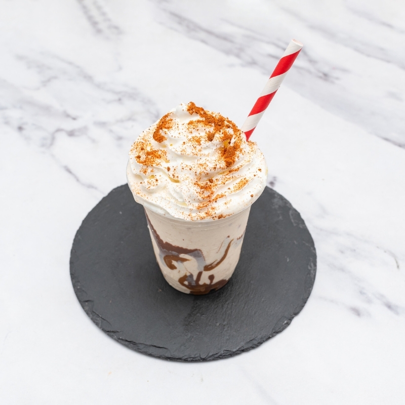 Dairy Milk and crushed Maltesers blended with soft serve, topped with whipped cream and chocolate powder.